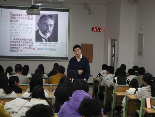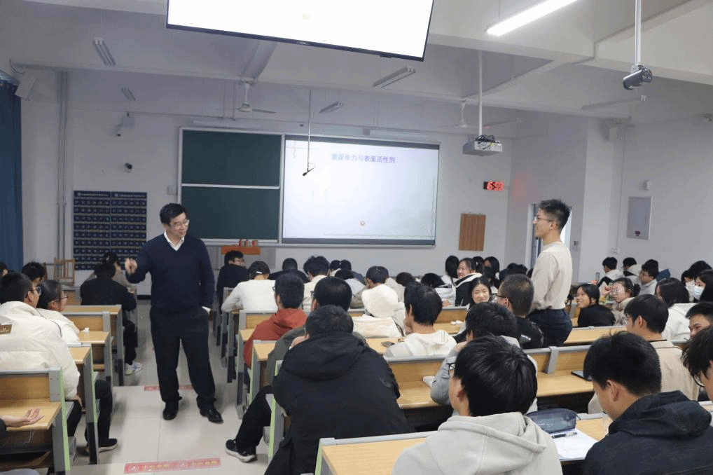 讲座伊始,黄教授以1932年诺贝尔化学奖得主欧文·朗缪尔的跨界传奇为切入点,生动诠释了科学突破的多元路径。他谈到,这位物理系出身的科学家,从通用电气公司的普通职员起步,因一次关键职业抉择投身界面化学研究,最终开创了单分子膜研究新领域。随后,黄教授将视野延伸至整部科学史,从富兰克林的雷电探索、牛顿的力学沉思、达芬奇的跨界创想,到席格蒙迪的胶体研究、德热纳的软物质理论,他以风趣幽默的语言串联起多位科学巨匠的探索故事。他告诉学生“珍贵的科学发现,往往藏在异想天开的坚持里。”同时,他还告诫学生要敢于坚守初心,不惧质疑嘲笑,将心中的科学构想转化为实践行动。讲座尾声,黄教授与现场同学即兴演绎科学情景互动剧,以鲜活有趣的形式诠释科学原理,将现场氛围推向高潮。