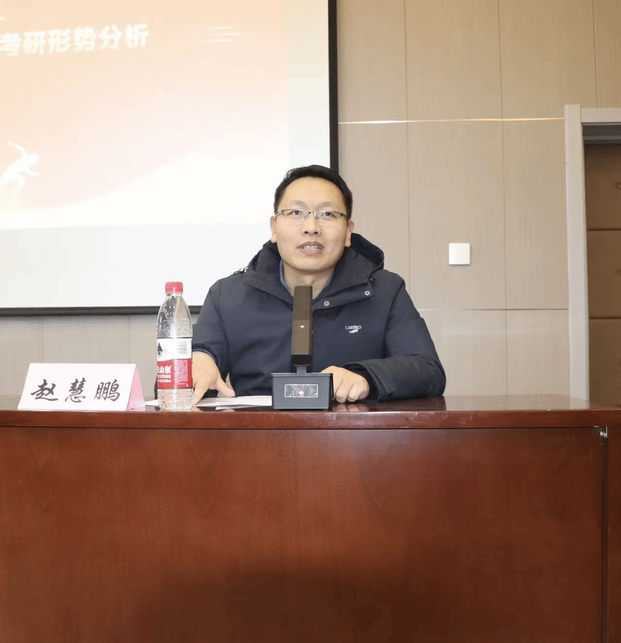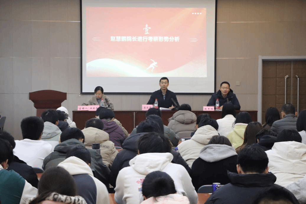 科研副院长赵慧鹏以高等教育发展规律和行业人才需求为切入点,对考研形势进行前瞻性分析。他强调,全国考研报名人数连续两年下滑,反映出高等教育从 “规模扩张” 向 “质量提升” 的转型,而顶尖高校推免比例的持续增加,进一步凸显了 “优中选优” 的人才选拔逻辑。他鼓励学子跳出 “唯名校论” 的认知局限,以长远发展眼光看待升学:既要以 “天道酬勤” 为信念,深耕专业领域、锤炼核心能力,冲击符合自身发展的理想院校;也要理性评估自身实力,将母校调剂纳入升学规划,借助母校学科优势实现阶梯式成长。同时要求班主任、辅导员加强政策研判与资源整合,为学生提供院校选择、专业匹配、调剂流程等全链条指导,帮助学子找准定位、少走弯路,在升学道路上稳步迈向职业理想。