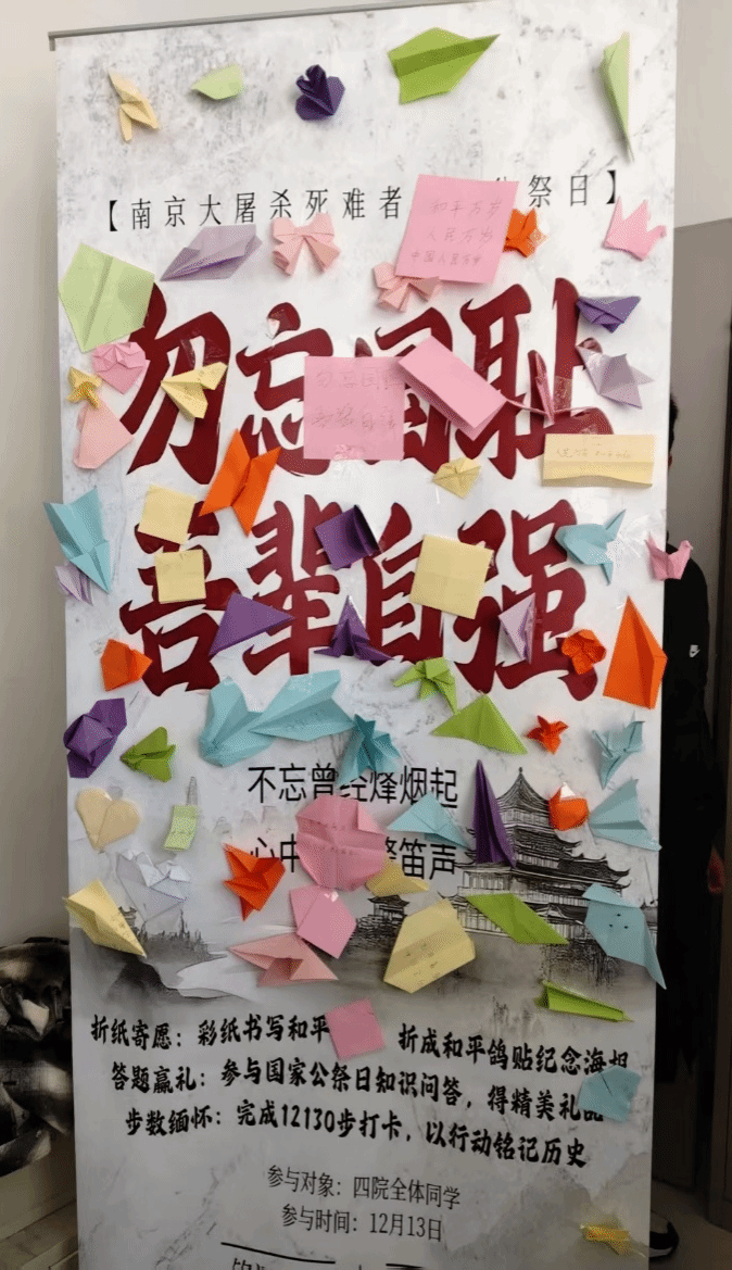 2025年12月13日,是第十二个“南京大屠杀死难者国家公祭日”。为深切缅怀先烈与遇难同胞,铭记历史苦难,厚植青年爱国情怀,激发学子报国热情,引导全体同学珍惜当下美好生活,万博体育 青志部举办了“勿忘苦难,向和而生”国家公祭日主题活动。活动得到了同学们的积极响应与踊跃参与,青年学子们以赤诚之心缅怀先辈,以实际行动传承爱国精神,彰显了新时代青年的责任与担当。
